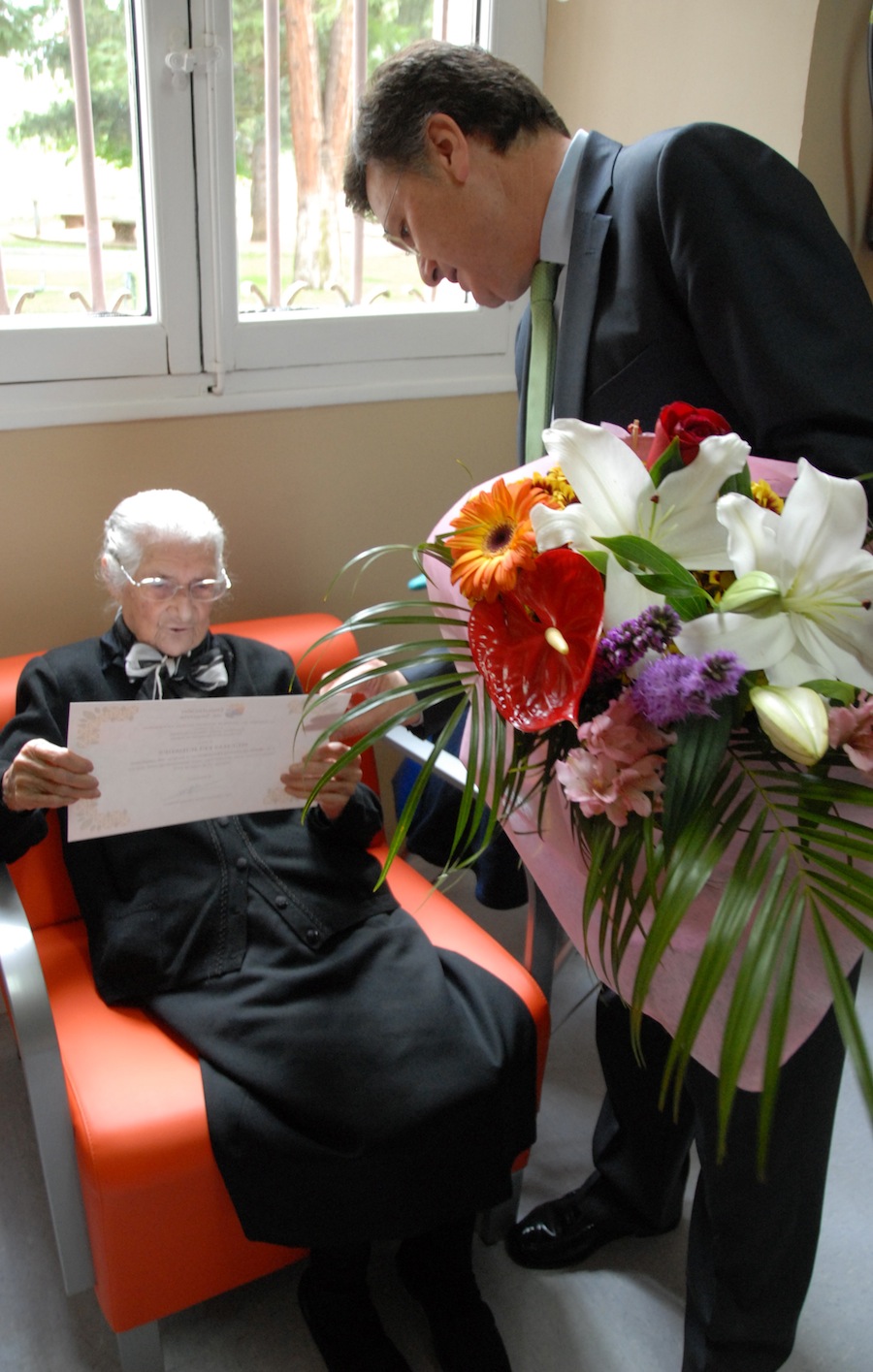 María de Frutos Provencio cumple 104 años y su secreto es «trabajar mucho y comer poco». Así se lo ha señalado al presidente de la Diputación, Francisco Vázquez, en la entrega que éste le ha hecho de un diploma que le acredita como la residente de mayor edad. María lleva desde el mes de febrero en el Centro de Servicios Sociales La Fuencisla donde reside desde esa fecha con total normalidad e independencia, después de alternar la misma entre los domicilios de sus hijos en Barcelona, Lugo y Encinas, municipio de la que es natural. ¡Muchas felicidades María!