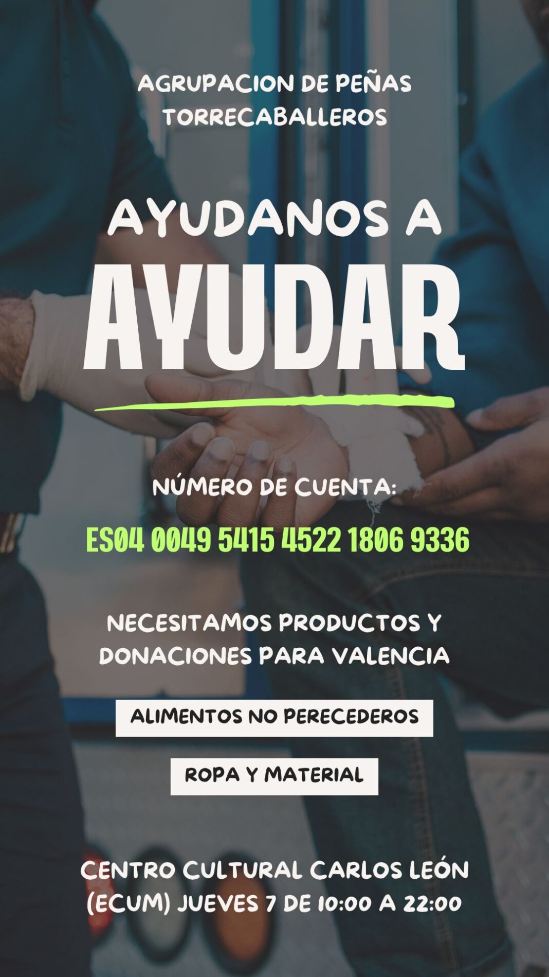 Pueden entregar sus donativos en la cuenta de Caixabank ES20 2100 1593 5802 0006 9950, indicando como concepto “AYUDA A VALENCIA”.