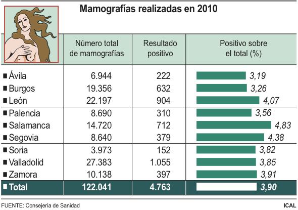 En 2010 se realizaron 122.041 mamografías de cribado en las quince unidades operativas que hay en Castilla y León. De ellas, 4.763 fueron positivas, un 3,9 por ciento del total, y, por tanto, derivadas a los hospitales de referencia para su estudio y confirmación diagnóstica.