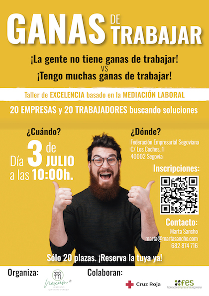 Si tienes ganas de trabajar en Segovia te acercamos una propuesta que, esperamos, te resulte interesante y es que para el proyecto de emprendimiento segoviano NEXUM se buscan 20 empresas en Segovia y 20 trabajadores. La Federación Empresarial Segoviana (FES) en colaboración con Cruz Roja Segovia, pone en marcha la iniciativa GANAS DE TRABAJAR.