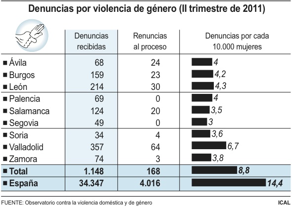 Un informe del Observatorio contra al violencia doméstica y de género del Consejo General del Poder Judicial, precisa que entre abril y junio de este año, los juzgados de la Comunidad contabilizaron 1.148 denuncias, el 3,3 por ciento de las 34.347 registradas en España. Del total de denuncias presentadas, en 168 casos las mujeres renunciaron al proceso. Así, el ratio de renuncias respecto al número de denuncias se situó en la Comunidad en el 14,63 por ciento, superior al 11,69 por ciento de la media nacional, donde se contabilizaron 4.016 renuncias a la tutela judicial. De las renuncias en la Comunidad, 87 correspondieron a españolas y 81 a extranjeras.