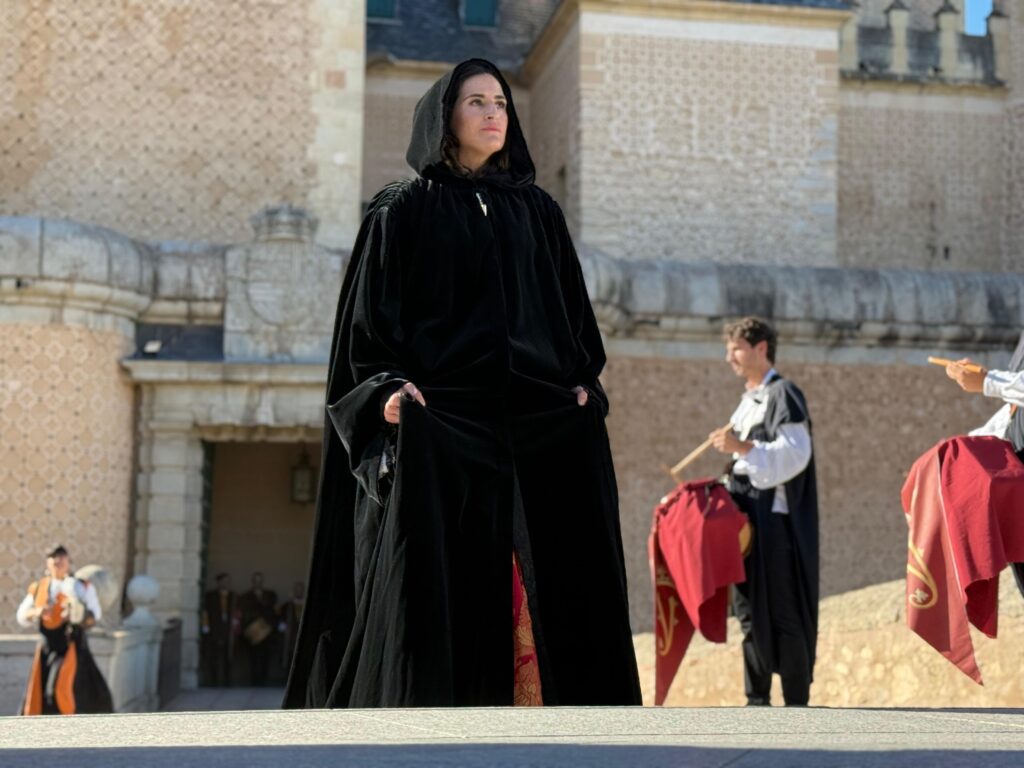 La actriz segoviana, miembro del grupo Catarsis, Cristina San Juan, fue la encargada de dar vida a una reina que cumplió con las expectativas de los presentes, en un espectáculo que unió historia, danza y música en el enlosado de la Catedral y en el que participaron 200 personas.