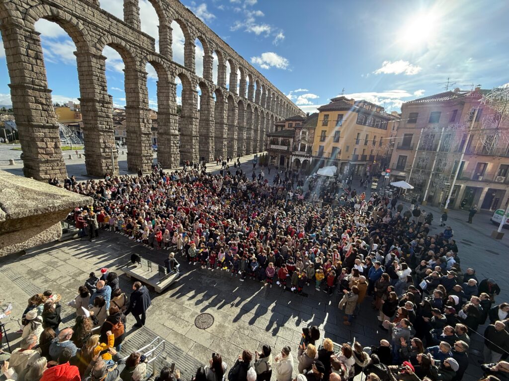 Alrededor de 800 niños y niñas de Educación Infantil y Primaria de este centro se han dado cita a los pies del Acueducto. Allí, han interpretado un villancico y han compartido un mensaje cargado de ilusión y valores propios de estas fechas.