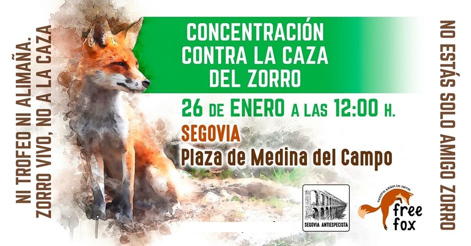 En respuesta a la convocatoria nacional de la plataforma «FREE FOX.NUESTROS AMIGOS LOS ZORROS» el próximo domingo 26 de Enero, el colectivo Segovia Antiespecista se unirá a otras ciudades de España, realizando una concentración a las 12.00 en la Plaza Medina del Campo (frente Hotel Las Sirenas).