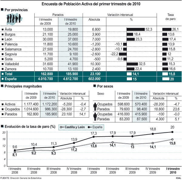 El paro creció en la Comunidad en 19.400 personas durante el primer trimestre de 2010, y eleva el número total de desempleados a 185.900 personas, es decir, el 15,86 por ciento de la población activa, más de cuatro puntos por debajo de la media nacional, que se sitúo en el 20,05 por ciento, según informaron hoy fuentes del Instituto Nacional de Estadística y la Junta de Castilla y León. El aumento del paro en Castilla y León en los últimos doce meses fue del 14,18 por ciento, también por debajo del registrado en el conjunto del país, que fue del 15,01 por ciento.