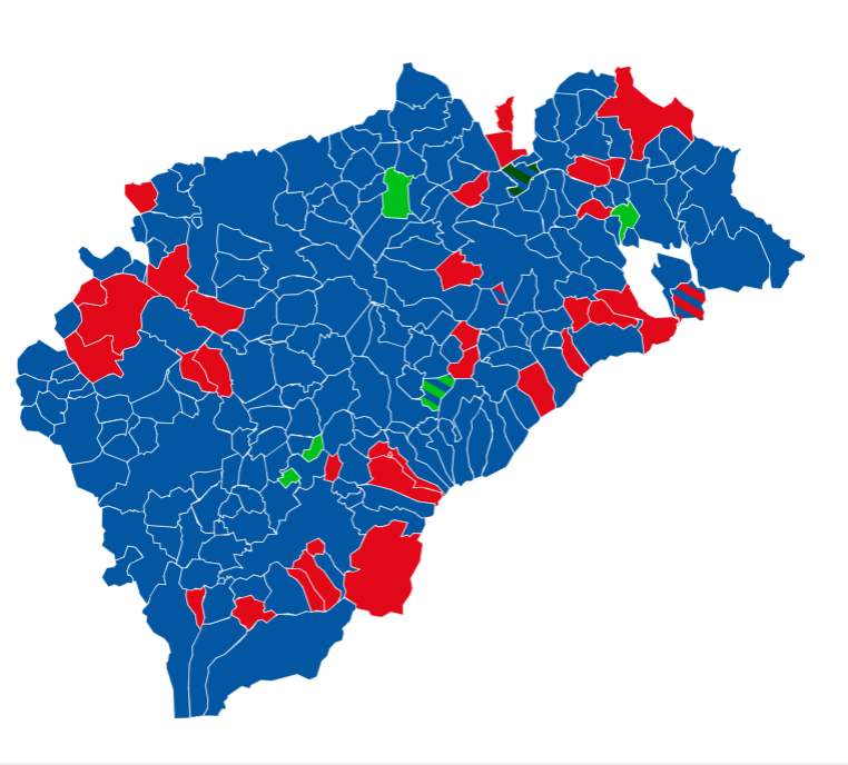 El mapa electoral de la provincia de Segovia aparece mayoritariamente teñido de azul, aunque con algunos puntos rojos en distintos municipios. Sin embargo, el reparto de escaños se mantiene muy ajustado entre los dos principales partidos.
