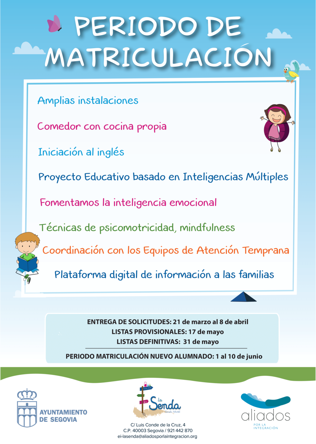 La Concejalía de Educación del Ayuntamiento de Segovia recuerda que también se ha abierto el plazo de matriculación para los centros escolares públicos de la ciudad de infantil y primaria. Dicho plazo abarca hasta el 6 de abril (incluido).
