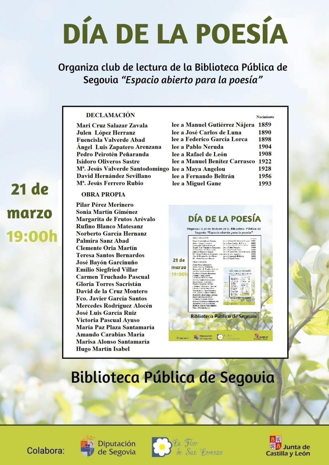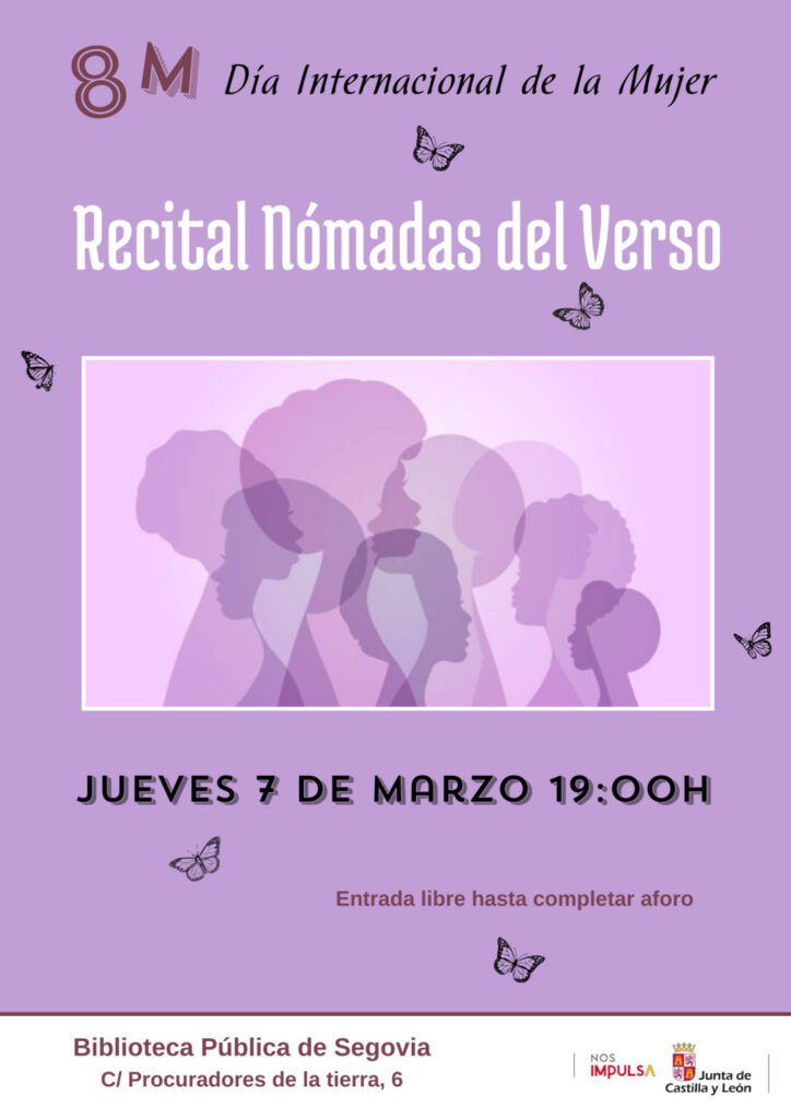 La poesía marca el ritmo de la programación cultural de la Biblioteca Pública de Segovia para el mes de marzo. El Día Mundial de la Poesía, que tendrá lugar el 21 de marzo a las siete de la tarde, las personas voluntarias, inscritas previamente, recitarán poemas propios y ajenos en un acto organizado por el club de lectura ‘Espacio abierto para la poesía’. Igualmente, dentro de las actividades del Día Internacional de la Mujer habrá un recital que correrá a cargo de Nómadas del Verso el 7 de marzo a las 19.00.