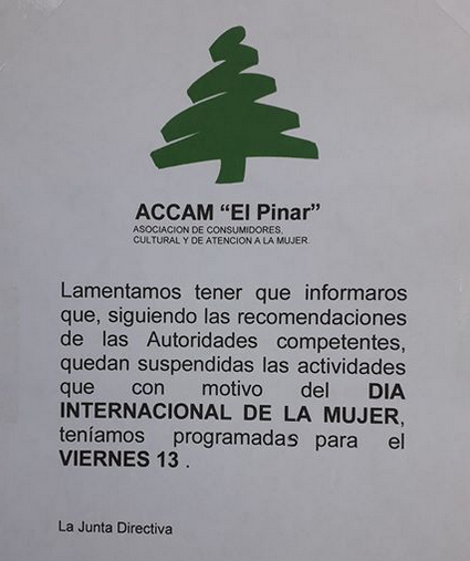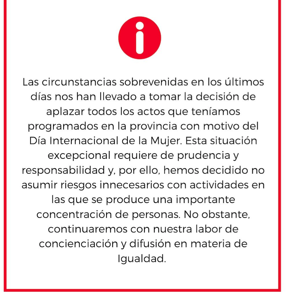La Diputación ha emitido un comunicado a través del cual anunciaba que todos los eventos relacionados con el Motivo del Día Internacional de la Mujer.