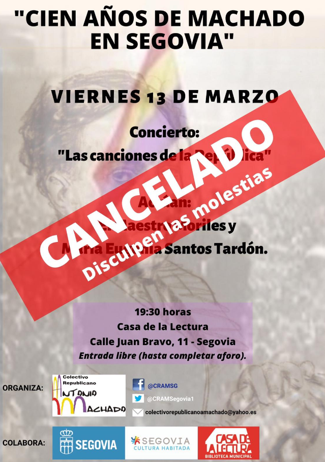 Queda suspendido el concierto «Las canciones de la República» programado para el viernes día 13 de marzo en la Casa de la Lectura a las 19:30 horas. El Colectivo Republicano Antonio Machado irá informando sobre su nueva fecha de programación.
