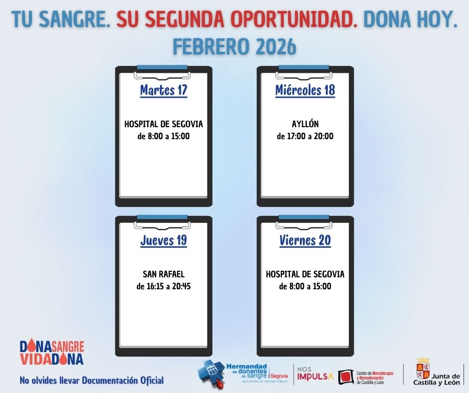Otras localidades de la provincia de Segovia en las que se podrá donar durante esta semana son: Ayllón, en su centro de salud el día de hoy (18 de febrero) de 17:00 a 20:00 horas; y San Rafael, en el Centro Joven El Recreo, el jueves 19 entre las 16:15 y las 20:45 horas.