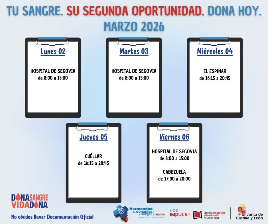 Como siempre, el Hospital General de Segovia actúa como punto fijo de donación de sangre. Por lo general, los lunes y martes se puede donar entre las 8:00 y las 15:00 horas; mientras que los viernes es de 15:00 a 21:30 (incorrecto en las imágenes).