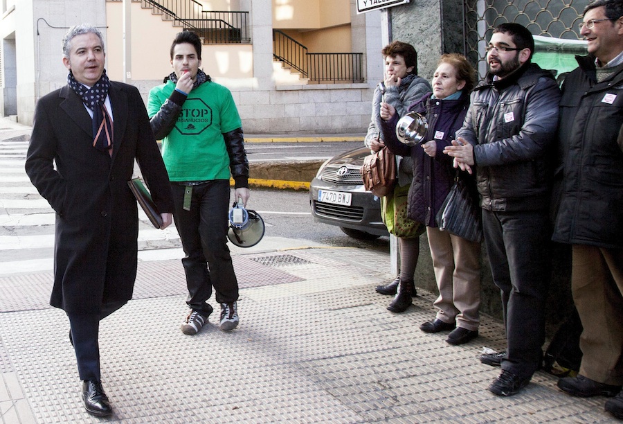 De Vicente dedicó unos siete minutos a responder las preguntas de la prensa junto a la entrada principal del juzgado pese a los gritos e insultos que recibió por parte de la docena de integrantes de la plataforma Stop Desahucios que permaneció allí durante la mayor parte de la mañana. No hubo más violencia que la verbal y tampoco intervención policial, aunque condicionaron la entrada y salida de la mayoría de los exconsejeros citados por el juez.