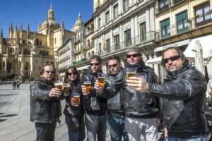 Durante la mañana, los moteros han pasado por la Plaza Mayor de la ciudad para invitar a los mayores de edad a rondas de cerveza SIN en los bares, recordando su mensaje: «opta por una cerveza SIN, no mezcles alcohol y carretera».