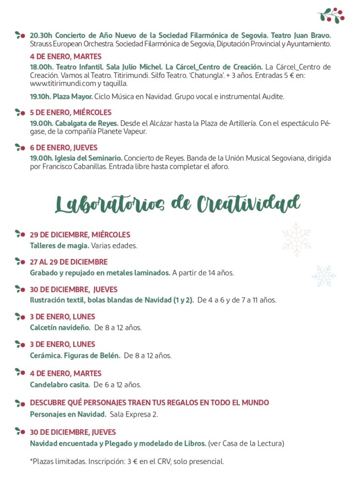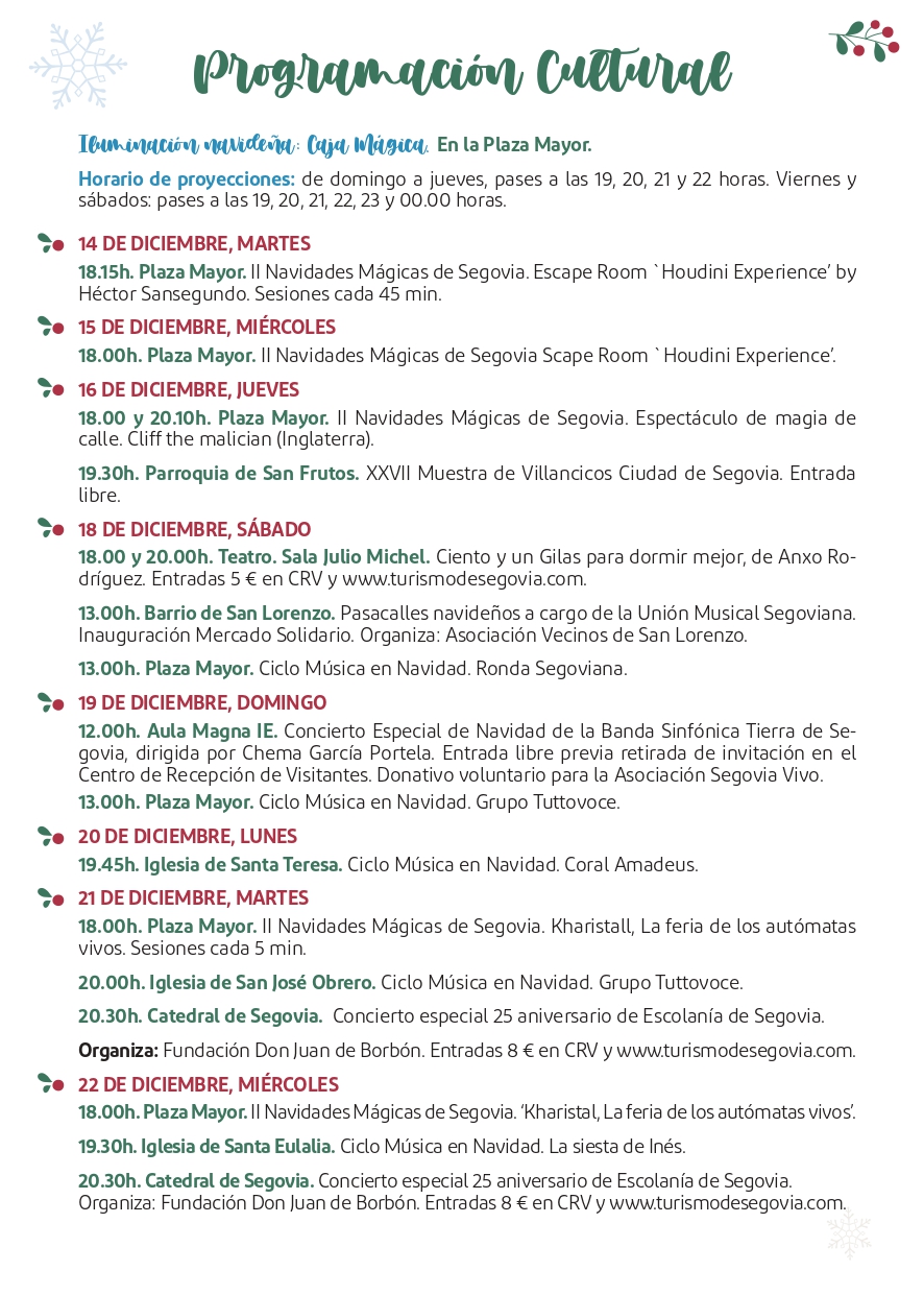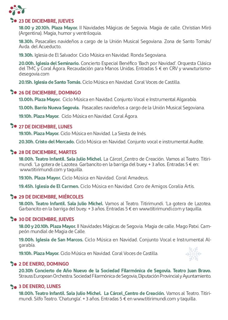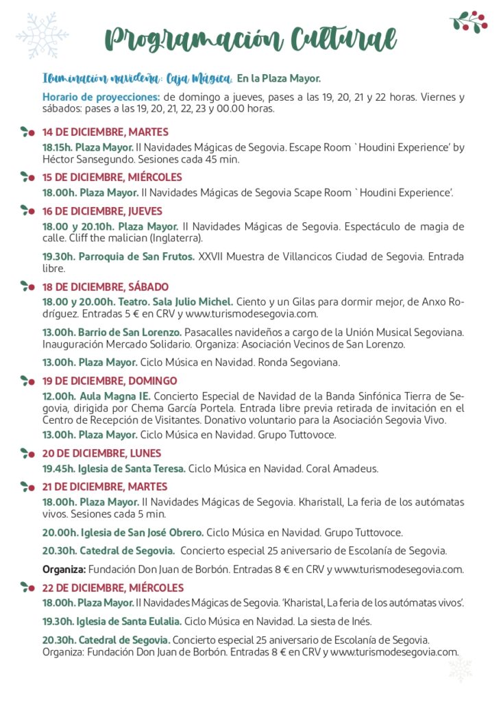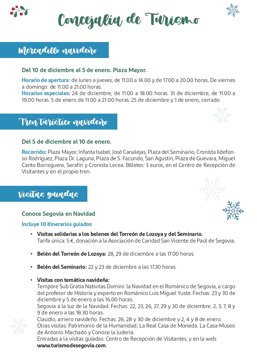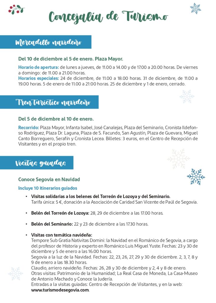 - Segovia a la luz de la Navidad. Un itinerario lleno de curiosidades y leyendas bajo el alumbrado navideño. Esta visita se oferta los días 22, 23, 26, 27, 29 y 30 de diciembre y 2, 3, 7, 8 y 9 de enero a las 18:30 horas.