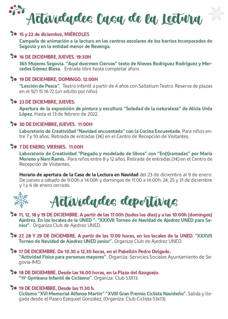 La Casa de la Lectura contará también con una programación especial de Navidad en la que se incluye teatro infantil a cargo de Saltatium teatro, una nueva edición del 365 Mujeres Segovia, la apertura de la exposición ‘Soledad de la Naturaleza’, de Alicia Urda, a partir del 23 de diciembre, o los talleres ‘Navidad encuentada’ y ‘Plegado y modelado de libros’.