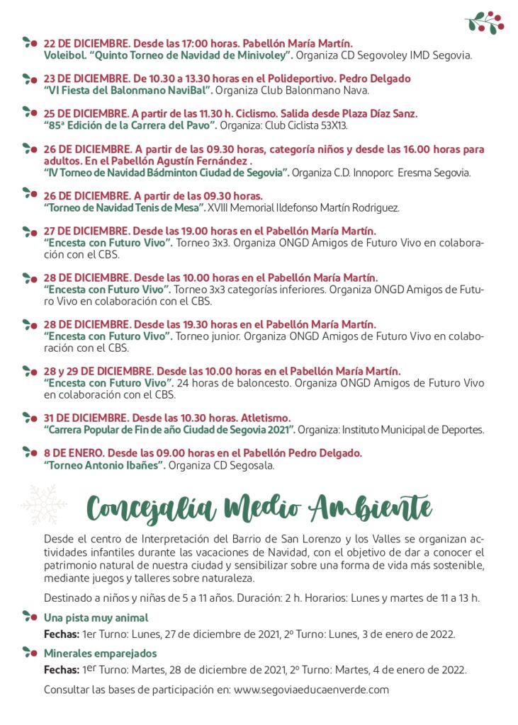 Por su parte, la concejalía de Medio Ambiente organiza desde el Centro de Interpretación del Barrio de San Lorenzo y Los Valles se organizan actividades infantiles durante las vacaciones de Navidad, con el objetivo de dar a conocer el patrimonio natural de nuestra ciudad y sensibilizar sobre una forma de vida más sostenible, mediante juegos y talleres sobre naturaleza. Destinado a niños y niñas de 5 a 11 años, con dos horas de duración, tendrán lugar los lunes y martes de 11 a 13 horas. Los cursos serán ‘Una pista muy animal’ y ‘Minerales emparejados’. Las bases se pueden consultar en www.segoviaeducaenverde.com