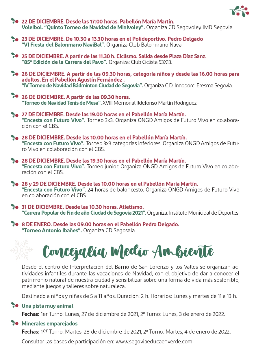 La programación navideña de la concejalía de Deportes se presentará posteriormente en detalle, pero en ella destacan las tradicional Carrera del Pavo, que alcanza su 85 edición o la Carrera Popular de Fin de Año, además de los Torneos de Navidad de ajedrez, balonmano, minivoley, badmington, baloncesto, fútbol sala, ciclismo y actividades físicas para personas mayores, en colaboración con Servicios Sociales del Ayuntamiento.
