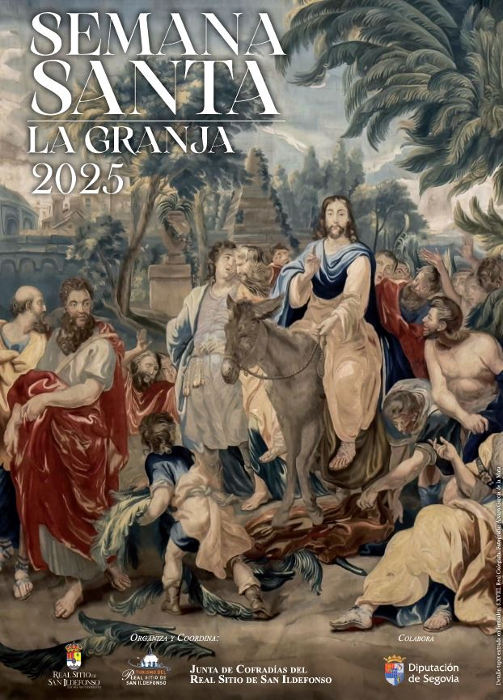 El cartel anunciador de la Semana Santa 2025 del Real Sitio de San Ildefonso está dedicado al tapiz “Entrada a Jerusalén” del siglo XVIII, que se encuentra en la Real Colegiata del Palacio Real de La Granja. Ha sido elegido con motivo de la conmemoración del 300 aniversario de la fundación del Cabildo de la Real e Insigne Colegiada de la Santísima Trinidad.