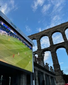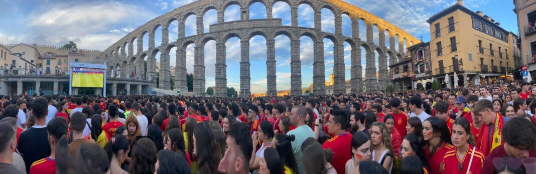 Camiseras rojas, caras pintadas, nervios e ilusión. A las siete de la tarde ya había decenas de personas a los pies del Acueducto. Dos horas antes del partido, también los nervios, empezaban a aparecer. A las ocho la plaza estaba «abarrotada» y ahora, silencio, gritos y cientos de personas (a la espera de una cifra una oficial).