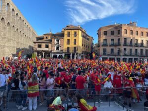 La final de la Eurocopa en la pantalla gigante del Ayuntamiento de Segovia, en colaboración con empresas y la Fundación Caja Rural se ha convertido en un atractivo y punto de encuentro. El colorido, las camisetas y los 2.000 aplaudidores y las 500 banderas, producidos por la empresa segoviana Mundo Laboral, un material distribuido por los colaborades de la iniciativa.