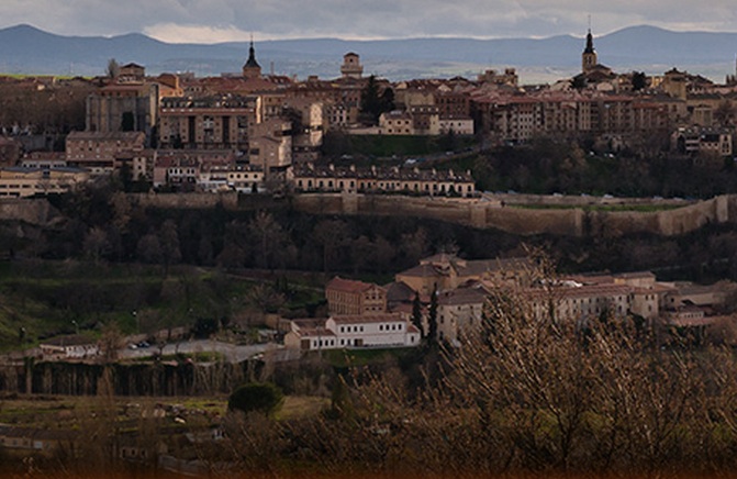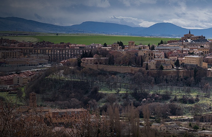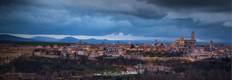 La despedida de las nubes en el cielo dan la bienvenida a las vistas de la sierra segoviana que contempla el espectacular juego de colores verdes, azules y marrones cobrizos en la ciudad. Tras una intensa lluvia que emborrona esta instantánea de cuento, la noche se aproxima y las luces empiezan a tomar protagonismo en la estampa que finaliza pasadas las 19.30 horas.