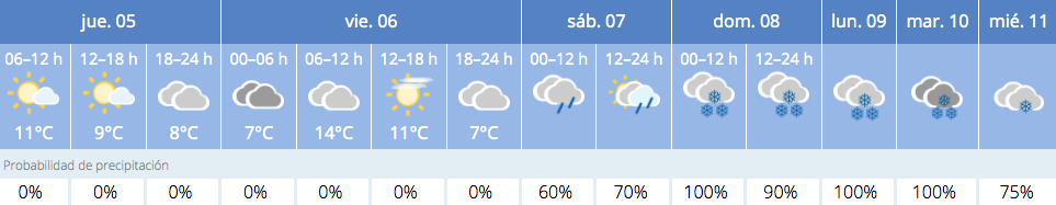 La previsión del sábado apunta a condiciones muy similares a las de este jueves. Las temperaturas oscilarán entre los 3 de mínima y los 12 de máxima. La diferencia es que hay entre un 60% y un 70% de probabilidad de lluvias.