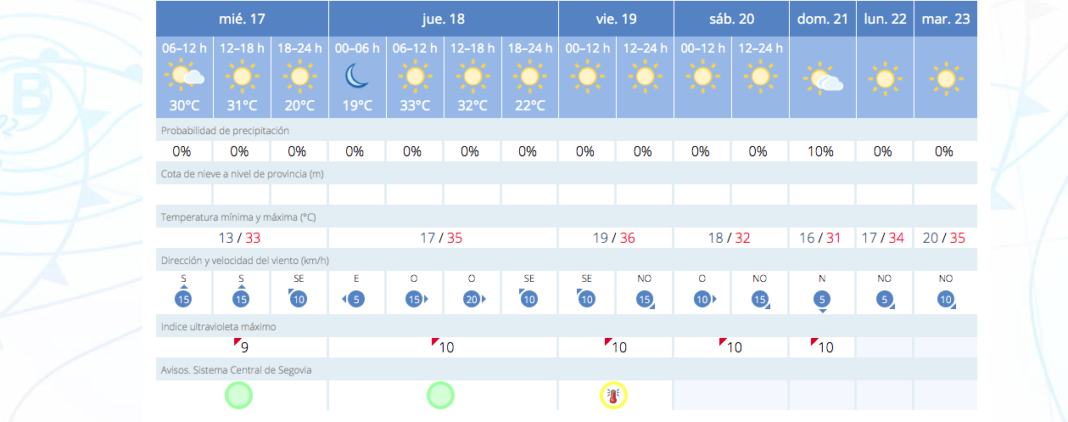 En cuanto a los valores mínimos también pegarán un subidón. Especialmente, lo notaremos esta noche. Pasaremos de 13 a 17 grados de mínima. El resto de la semana, las temperaturas mínima oscilarán en Segovia los 17 y 19 grados por las noches.