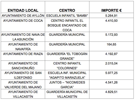 La Consejería de Familia e Igualdad de Oportunidades de la Junta de Castilla y León ha resuelto la convocatoria de subvenciones para financiar gastos de mantenimiento de Centros Infantiles de 0 a 3 años, a entidades locales de la Comunidad Autónoma, durante el ejercicio 2011. Nueve municipios de la provincia de Segovia recibirán, en total, una ayuda de 36.568,94 euros para este fin.