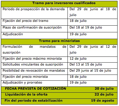La horquilla de precios indicativa y no vinculante se ha establecido entre 4,41 y 5,05 euros por acción. La fijación del precio máximo minorista se producirá el próximo 12 de julio. El periodo de revocación de mandatos terminará el 15 del mismo mes.