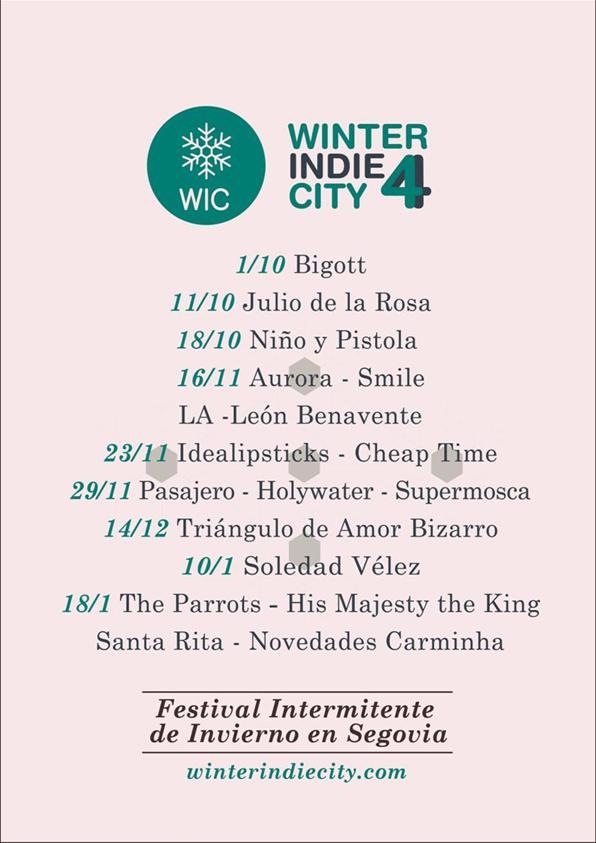 Tiran la casa por la ventana, hacen de tripas corazón, se parten la camisa, y se rasgan las vestiduras. Llamadlo como queráis, pero el festival Winter Indie City (WIC) vuelve a Segovia este invierno y no se andan con pequeñeces en su cuarta edición. Bigott, Julio de la Rosa, Niño y Pistola, Aurora y León Benavente, Triángulo de Amor Bizarro y la triada Pasajero, Holywater y Supermosca, ya han confirmado su asistencia al festival en las próximas fechas.