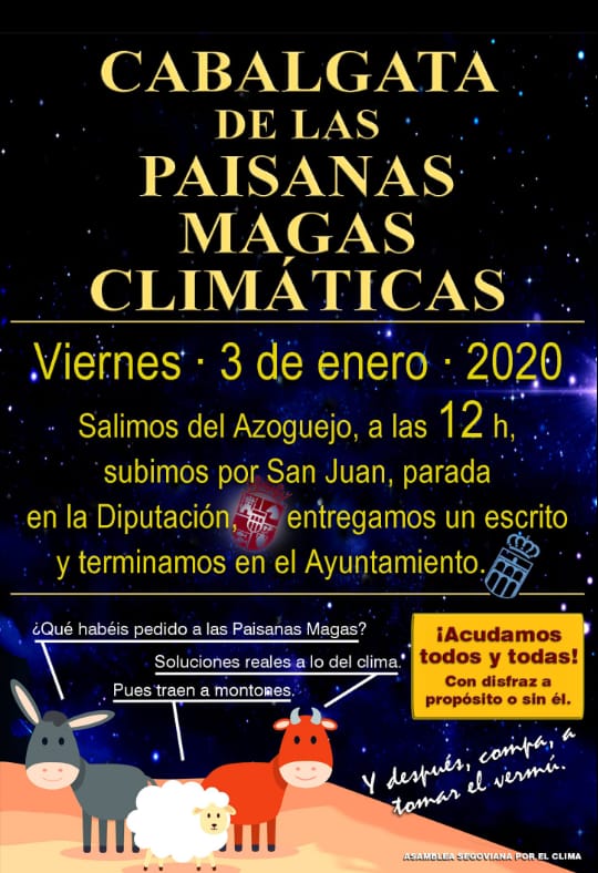 El próximo día 3 de enero de 2020 a las 12:00 Las Paisanas Magas Climáticas de la Asamblea Segoviana por el Clima tienen una cita con todos los segovianos y segovianas que deseen acompañarles en su primera cabalgata. Durante el recorrido visitarán las dos principales instituciones de la ciudad y de la provincia (el ayuntamiento y la diputación provincial) con el fin de obsequiarles con un presente y registrar una carta con sus peticiones para el año nuevo en materia climática.
