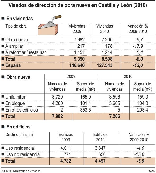 Por tanto, la parálisis de la construcción en la autonomía fue similar al comportamiento que experimentó el sector en España, según recoge la estadística elaborada por el Ministerio de Fomento. De esta forma, el sector castellano y leonés sumó 776 visados de obra nueva para vivienda menos en 2010, que en 2009, cuando alcanzaron los 7.206. Sin embargo, entre 2008 y 2010, el análisis de las cifras es más negativo ya que muestra un descenso de actividad del 60,27 por ciento en 24 meses.