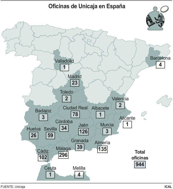 De esta forma, Castilla y León pasaría de tener 498 oficinas a 499, ya que Unicaja únicamente aporta a la región una sucursal ubicada en Valladolid capital, con lo que los clientes de la región dispondrían del 27 por ciento de las 1.793 sucursales en el conjunto de España tras la posible integración, mientras que Andalucía, con 844, tendría casi la mitad, el 47 por ciento, ya que a las 27 que allí posee Caja España-Caja Duero se le sumarían las 817 de la malagueña, donde evidentemente está fuertemente expandida.
