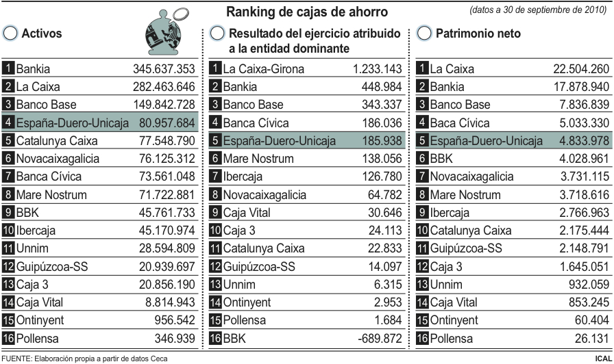 La integración entre Caja España- Caja Duero y la andaluza Unicaja daría lugar a la cuarta entidad del sector por activos y la quinta por patrimonio neto. En concreto y según los últimos datos publicados por la Confederación Española de Cajas de Ahorros (Ceca), correspondientes al tercer trimestre de 2010, la nueva entidad contaría con activos por 80.957,6 millones de euros, situándose por detrás de Bankia, con 345.637,3 millones, La Caixa, con 282.463,6 y Banco Base, con 149.842,7.