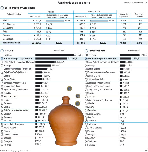 Esta ‘fusión fría’ dará lugar a la segunda entidad del país, por detrás de La Caixa que hoy mismo ha anunciado el inicio de conversaciones para la absorción de Caixa Girona, con unos activos que suman 227.561 millones de euros y un patrimonio neto de 12.130 millones. Las seis cajas de ahorro que se integrarán suman 19.140 empleados repartidos en 2.967 oficinas. De este modo, Caja de Ávila aportará el 3,13 por ciento de los activos y el 2,96 por ciento del patrimonio neto del nuevo grupo, mientras que Caja Segovia sumará el 2,71 por ciento de los activos y el 2,65 del patrimonio neto.