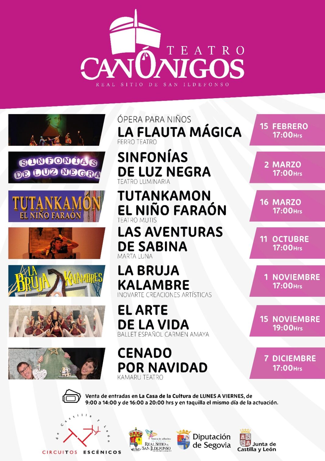 El calendario de actuaciones arrancará este sábado, 15 de febrero, con La Flauta Mágica, una ópera infantil. Las siguientes citas tendrán lugar el 2 de marzo, con Sinfonía de luz negra; el 16 de marzo, con Tutankamón El Niño Faraón; el 11 de octubre, con Las Aventuras de Sabina; el 1 de Noviembre, con La Bruja Kalambre; el 15 de Noviembre, con EL Arte de La Vida, Ballet Español de Carmen Amaya; y el 7 de diciembre, con Cenando por Navidad.