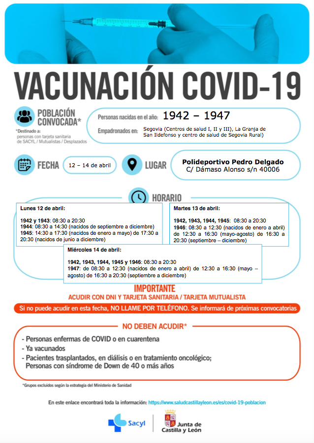La próxima semana -del 12 al 16 de abril-, la Junta de Castilla y León en Segovia continúa la vacunación contra la COVID-19 en el pabellón polideportivo ‘Pedro Delgado’ de la capital a las personas nacidas en 1942, 1943 y 1944 y amplía el llamamiento también a los nacidos en los años 1945, 1946, 1947, 1948 y 1949. De acuerdo con la estrategia de vacunación frente a COVID-19 en España, en esta franja de edad, que abarca desde los 72 a los 79 años, se administran vacunas de ARNm (de Pfizer/BioNTech o de Moderna).