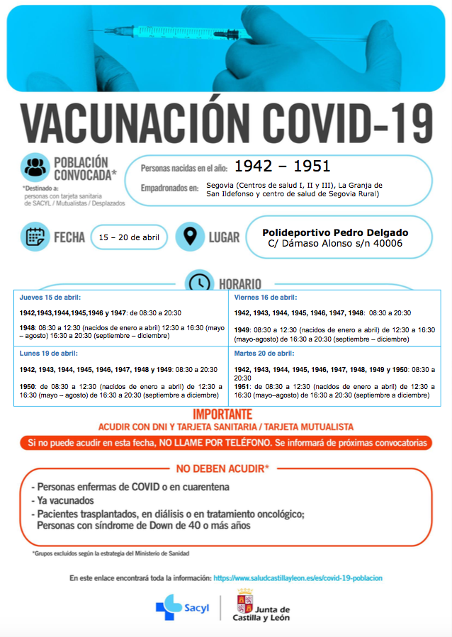 Del 15 al 20 de abril, se vacunará en Segovia a los nacidos entre 1942 y 1951: