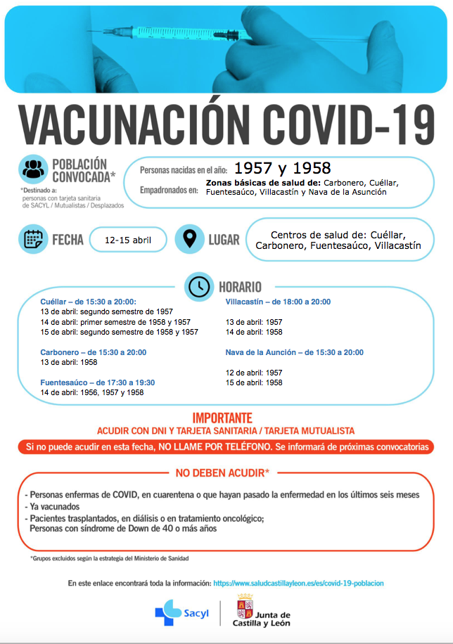 En cuanto a los centros de salud del medio rural, se va a vacunar por llamamiento a los nacidos en 1957 y 1958 la próxima semana en Cuéllar, Carbonero el Mayor, Nava de la Asunción, Fuentesaúco de Fuentidueña y Villacastín.