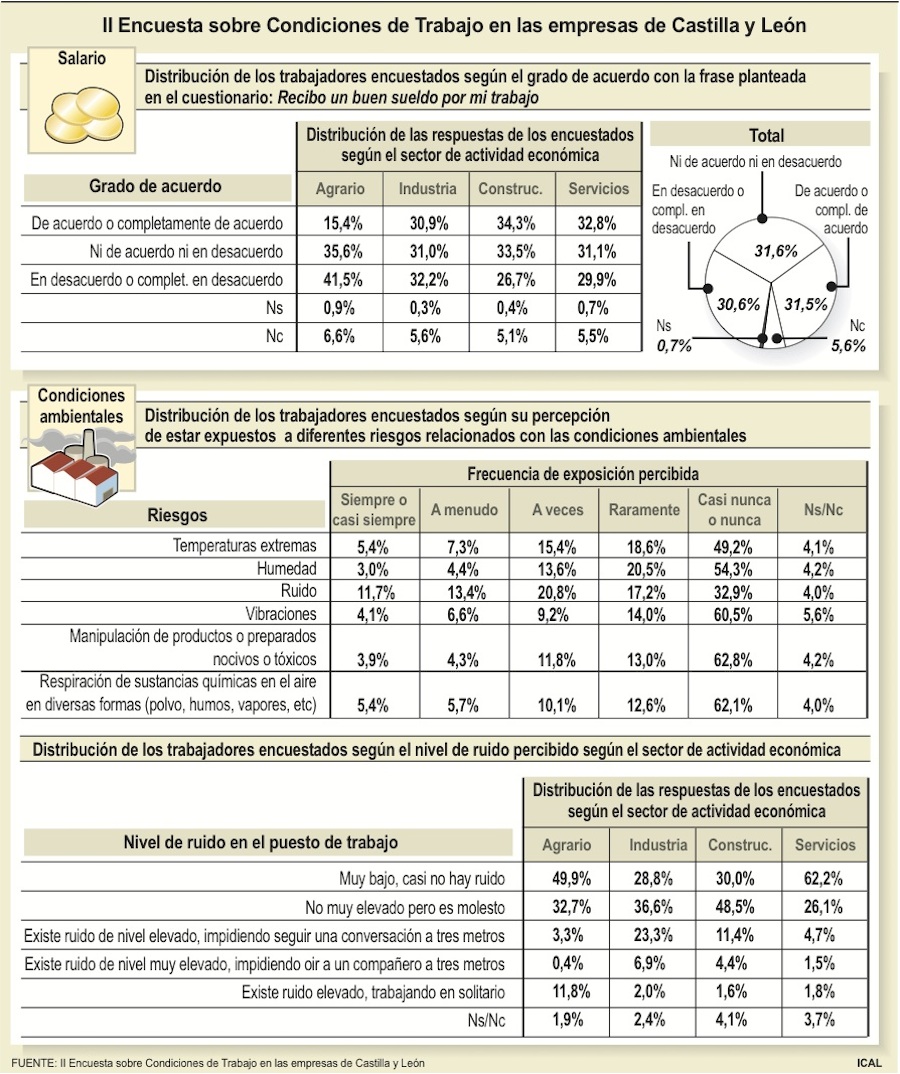 Casi un tercio de los trabajadores de Castilla y León (30,6%) se muestra en desacuerdo con su sueldo o salario en relación a la labor que desempeña, mientras que el grado de acuerdo se sitúa prácticamente en la misma proporción, con un 31,5%. El dato es muy desigual en función de los diferentes sectores. En este sentido, son los que corresponden al agrario los que tienen la peor opinión sobre su sueldo, ya que hasta el 41,5 por ciento de los empleados considera que no está bien pagado, frente al 15,4 que cree que sí.