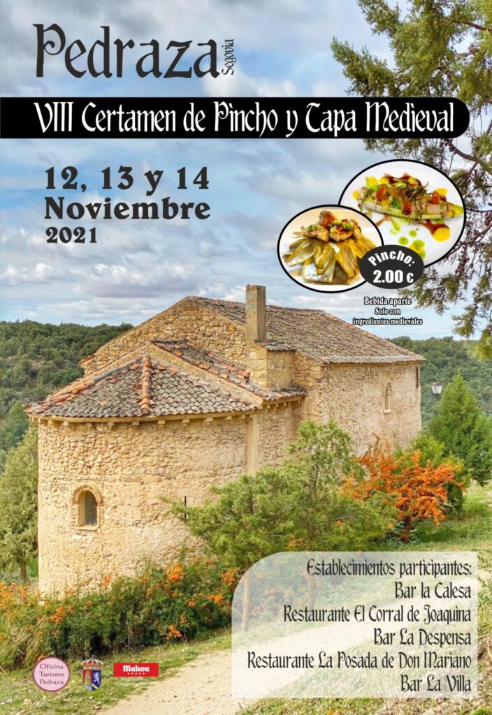 Como ya es tradición, los establecimientos participantes ofrecerán una gran variedad de tapas, elaboradas únicamente con ingredientes que existieron en la Península Ibérica en el medievo, en un entorno único como es la Villa de Pedraza y acompañados de un ambiente muy agradable entre sus vecinos y visitantes.