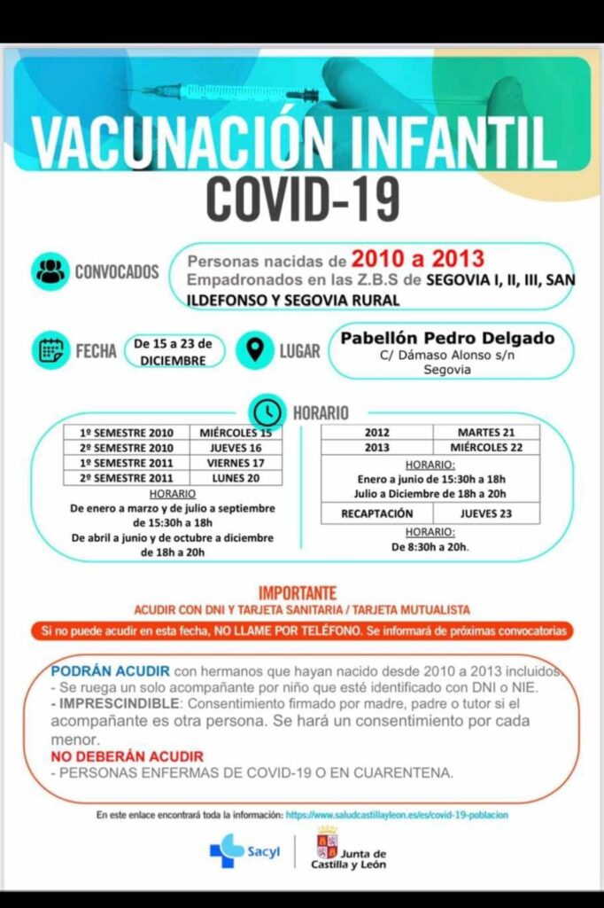 Los niños y niñas nacidos entre 2010 y 2013 empadronados en las Zonas Básicas de Salud Segovia I, Segovia II y Segovia III, San Ildefonso y Segovia Rural están llamados a vacunarse contra la Covid-19 del 15 al 23 de diciembre, en el Pabellón Pedro Delgado.