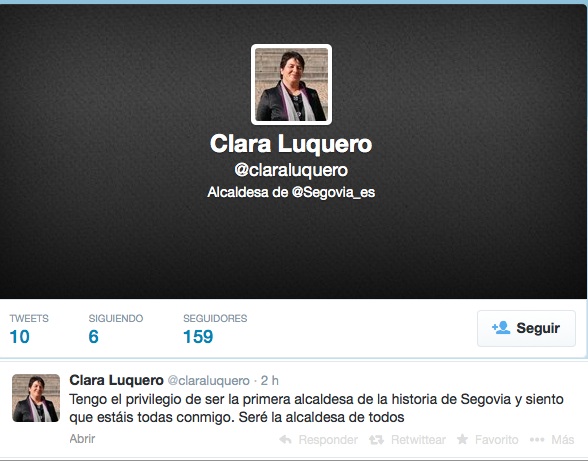 Aunque alguna vez ha señalado no sentirse muy afín con las redes sociales, Clara Luquero, ha estrenado cuenta de Twitter, gestionada presumiblemente por su nuevo equipo de comunicación, el mismo que ha acompañado a Arahuetes hasta su renuncia. En el perfil, @claraluquero, la define como Alcaldesa de @Segovia_es y sus primeros tweets han estado protagonizados por estractos por su primer discurso como regidora.