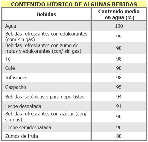 Por ello, y para que se ingiera el líquido necesario, los expertos aconsejan que junto con el agua, nos hidratemos tomando también líquidos de mejor palatabilidad, cuyo consumo resulta más fácil y agradable, como refrescos, zumos, infusiones, leche, sopas, y alimentos con un alto contenido hídrico como frutas y verduras.