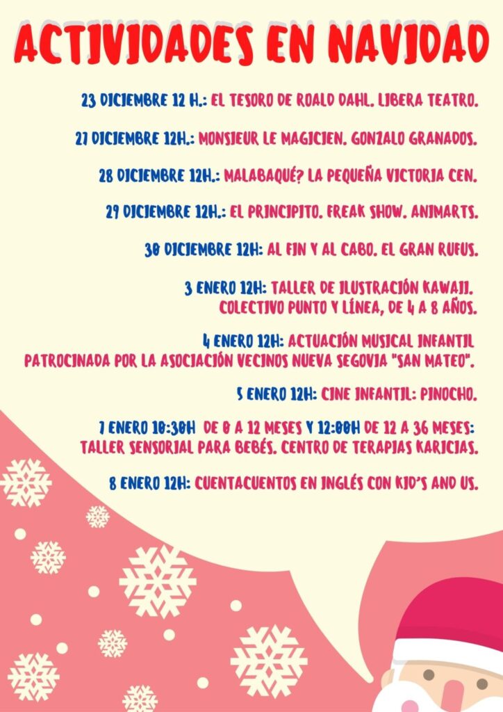 La programación navideña se completa con la actuación musical organizada por la Asociación de Vecinos de Nueva Segovia, el martes 4 de enero a las 12.00 horas. Para acudir es necesario recoger una invitación previa. El miércoles 5 de enero a las 12.00 h. se proyecta la película infantil ‘Pinocho’, con entrada libre hasta completar aforo. Para concluir la Navidad, el sábado 8 de enero a las 12.00 horas Kid’s & Us realiza un cuentacuentos en inglés para niños de 3 a 7 años. Para acudir al cuentacuentos es necesario inscribirse previamente.