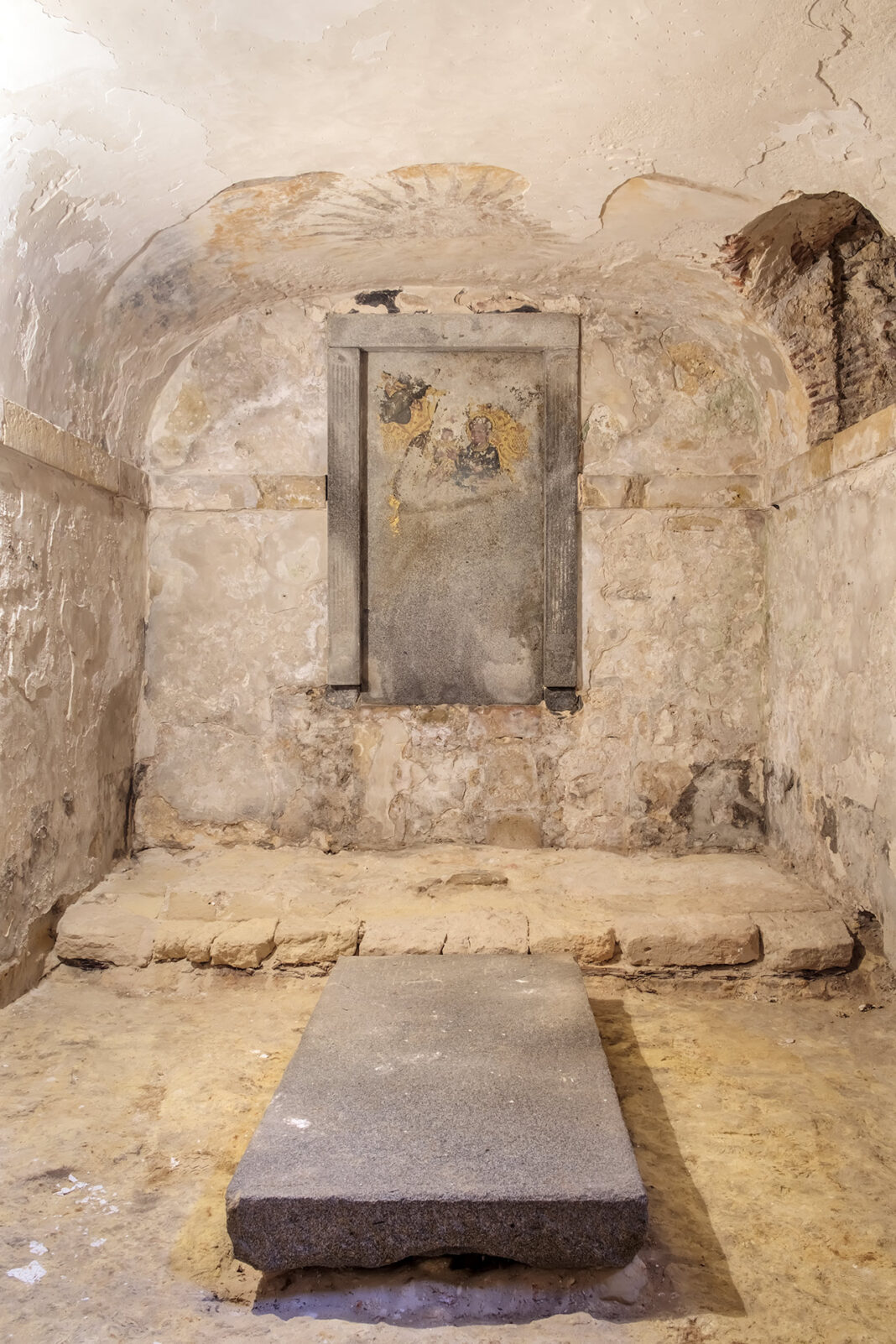 Debido a la humedad procedente del claustro y del propio subsuelo del templo, la conservación de las pinturas murales se ha visto comprometida, especialmente en la sala de mayor tamaño, unido a las sucesivas capas de encalado aplicadas que han tapado la decoración original. La pintura de la losa de granito ha desaparecido en su mayor parte quedando visible de forma más nítida el rostro y cuerpo del Niño Jesús.
