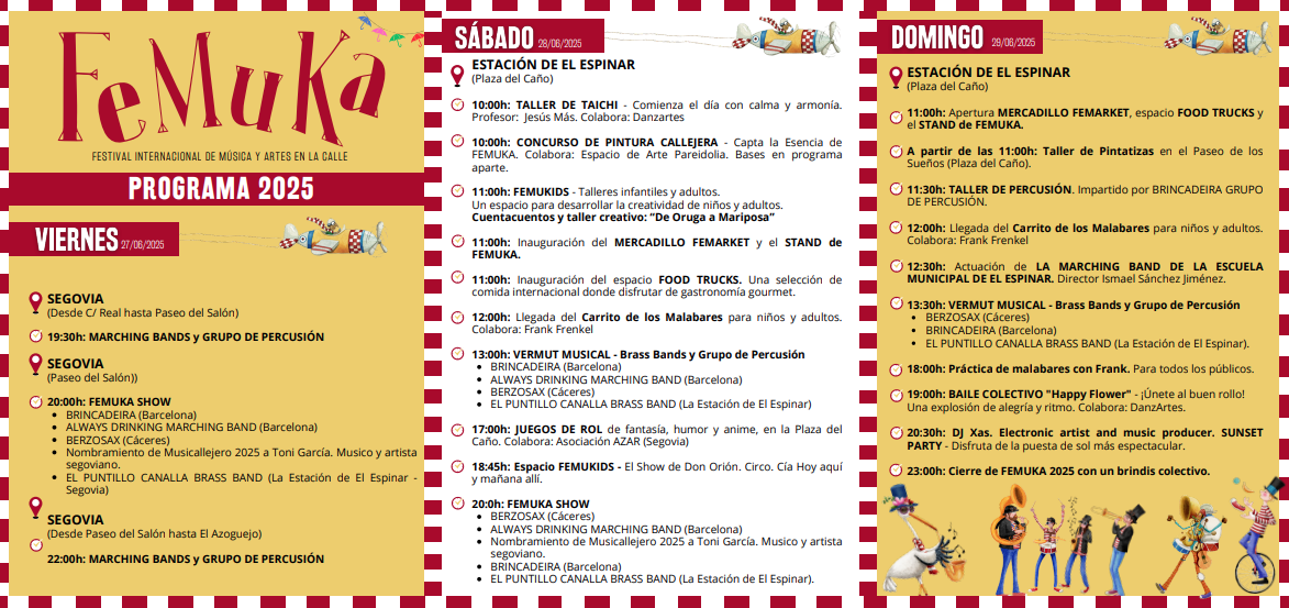 Brinkadeira Grupo de Percusión (Barcelona), Berzosax (Cáceres), Always Drinking Marching Band (Barcelona) y El Puntillo Canalla Brass Band (Estación de El Espinar), se engargarán de que FEMUKA 2025 no deje a nadie indiferente y de que esté lleno de momentos inolvidables.