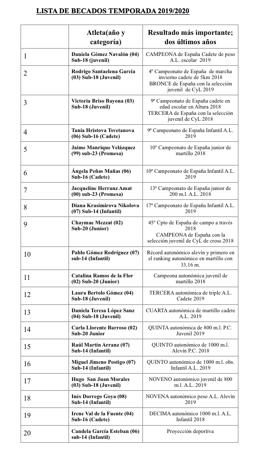 Destacar que de los 20 atletas becados, 4 han conseguido subir a un podium en un campeonato de España individual o con la selección de Castilla y León.