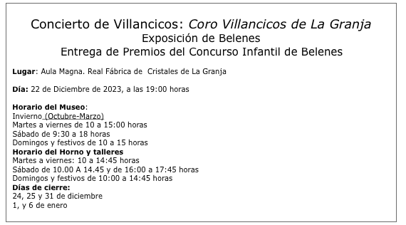 La Real Fábrica de Cristales de San Ildefonso acogerá el día 22 de diciembre de 2023, a las 19:00 horas, el tradicional concierto de Villancicos a cargo del Coro de La Granja, bajo la dirección de Javier Lázaro, con un repertorio de Villancicos populares del folklore africano, sudamericano y español, con canciones propias del director y recuperadas de archivos de las catedrales de Segovia y de Oaxaca de México, del siglo XVII.